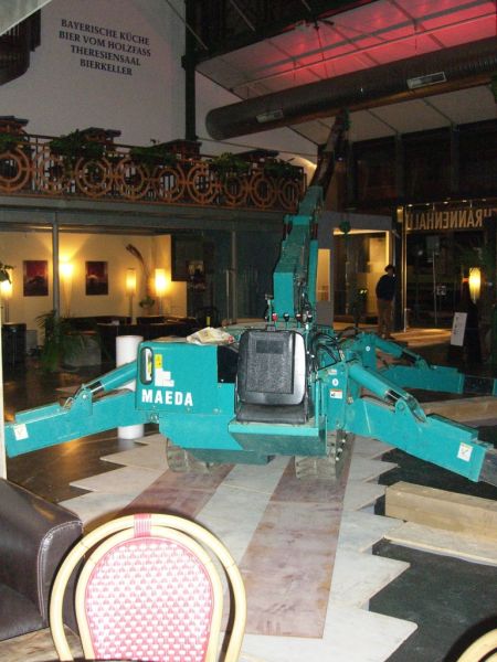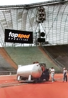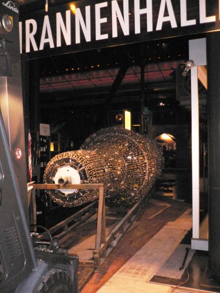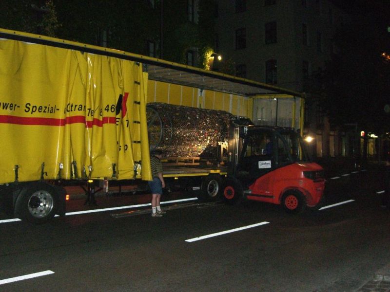 Verbringung eines Kunstwerkes (Flasche aus Flaschenöffnern) in die bekannte Münchner Schrannenhalle. Die Einbringung musste innerhalb der Betriebsruhe von 00.00 Uhr bis 05.00 Uhr erfolgen. Aufgrund der Beschaffenheit des Hallenbodens (Traglast) musste der gesamte Transportweg mit Bodenplaten ausgelegt werden. Maße des Exponats: 6,90 Höhe - Durchmesser 2,30 m. - Höhe der Halle 9,0 m! |